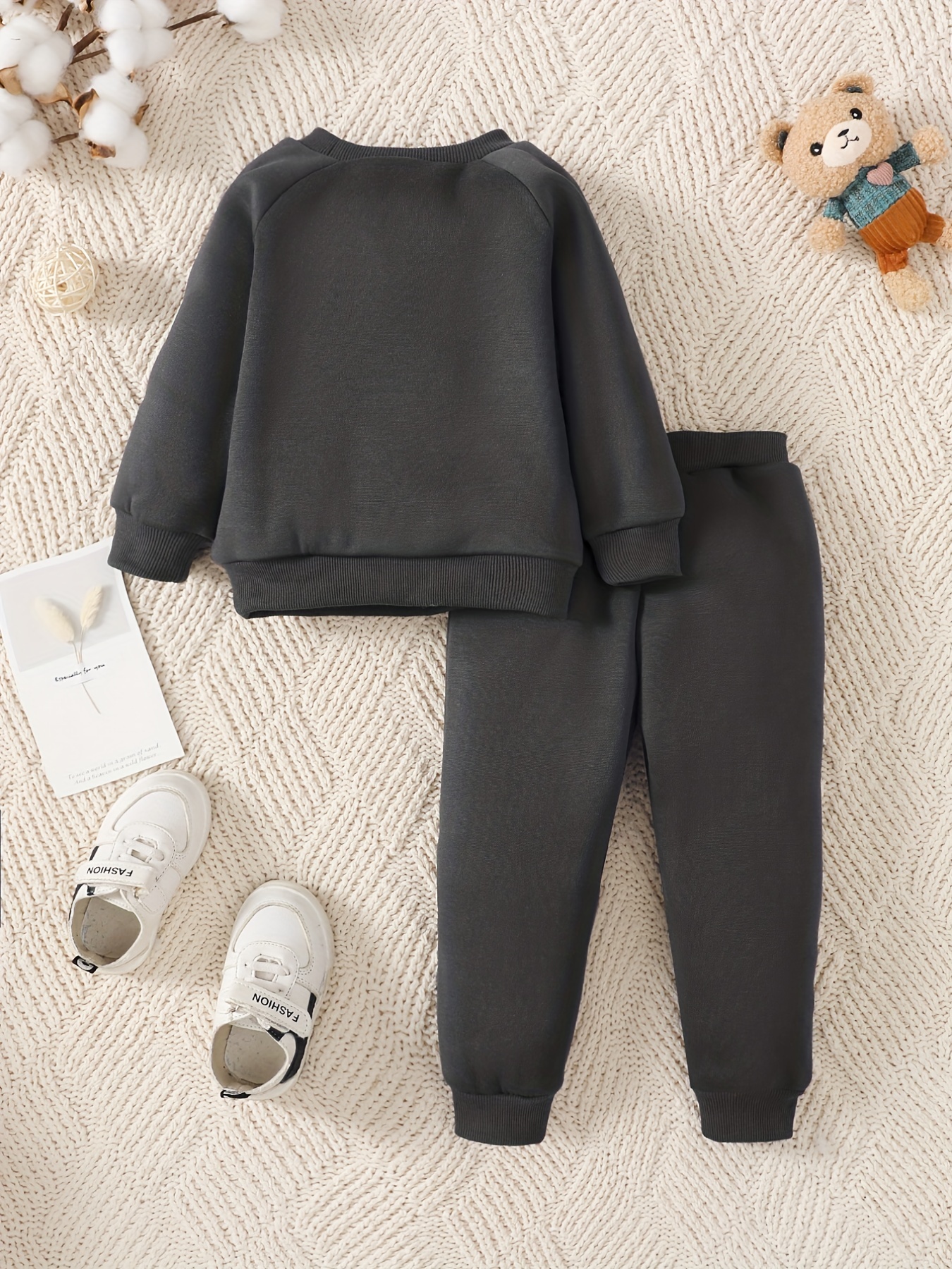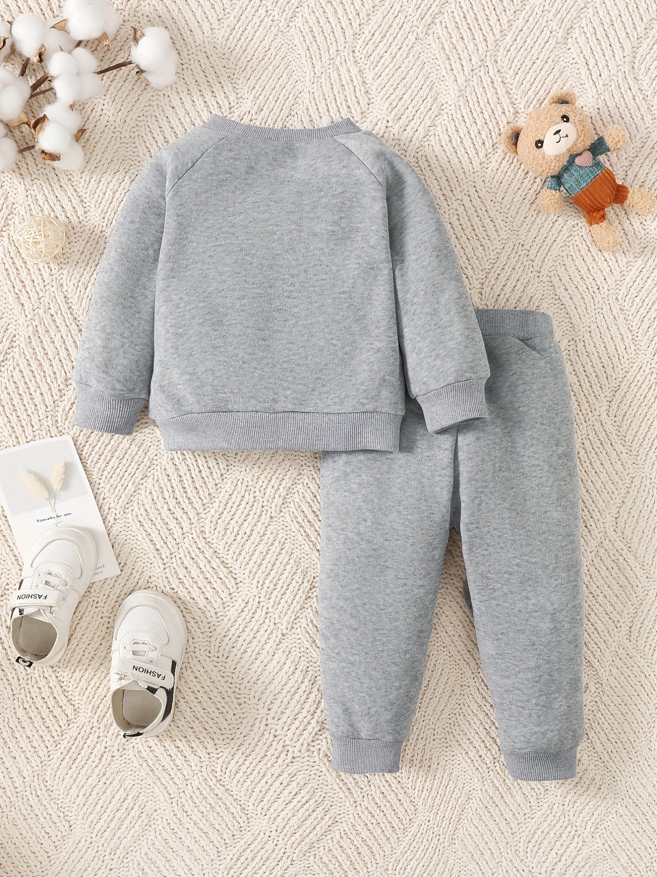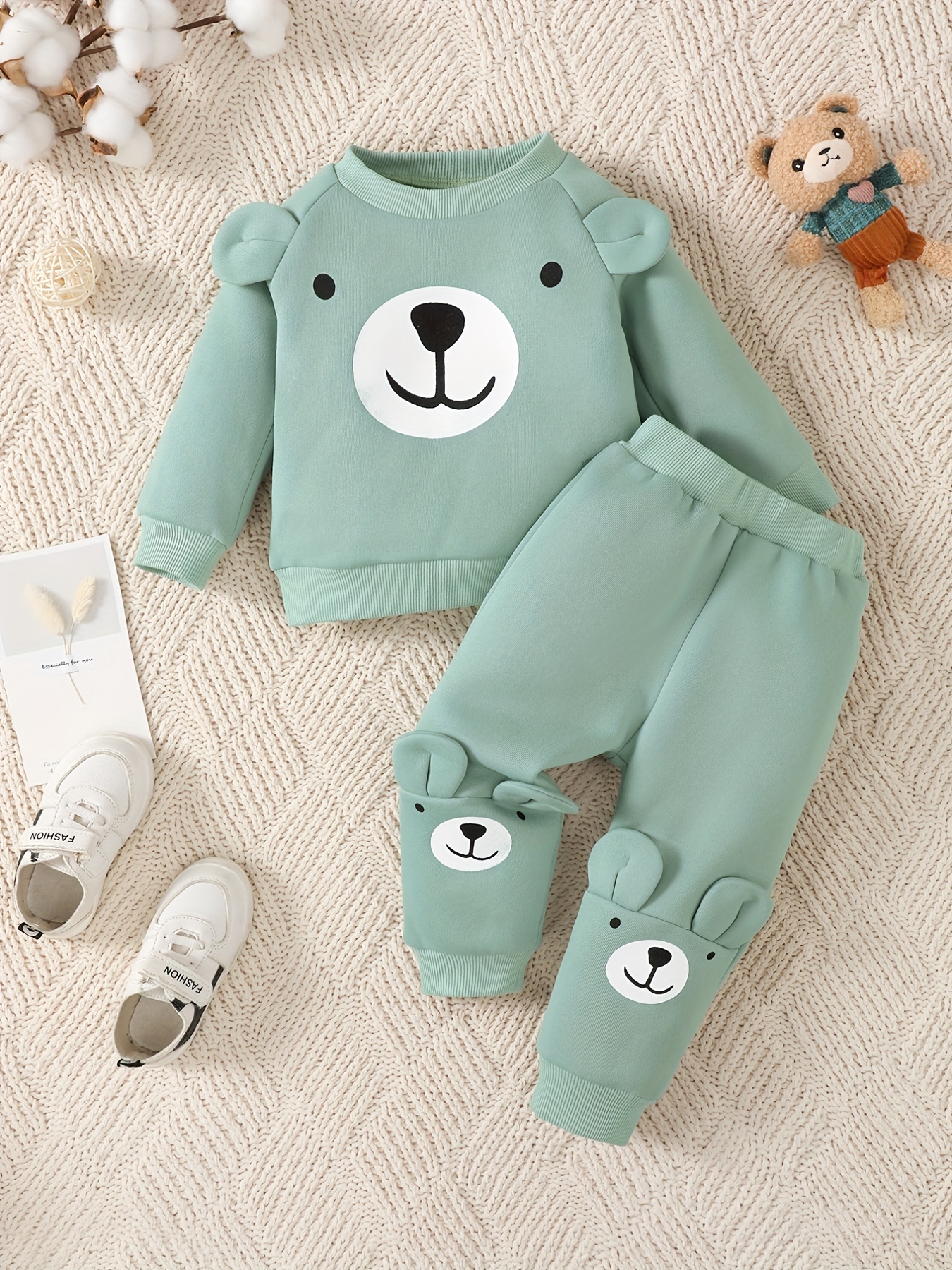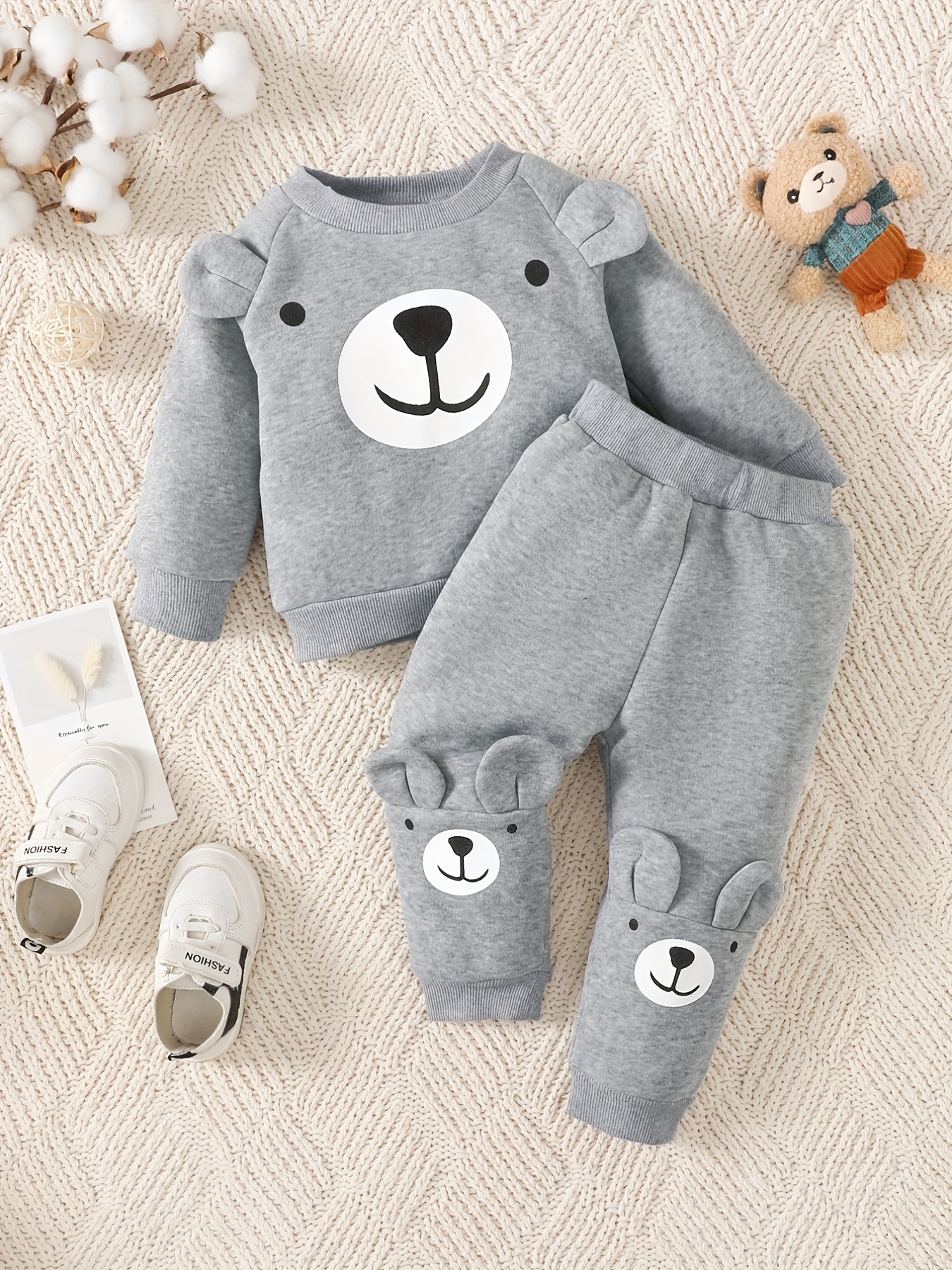 2pcs Baby Casual Cute Warm Fleece Outfits, Bear Pattern Round Neck Long Sleeve Sweatshirt & Bear Print Pants Outdoor Set For Autumn And Winter