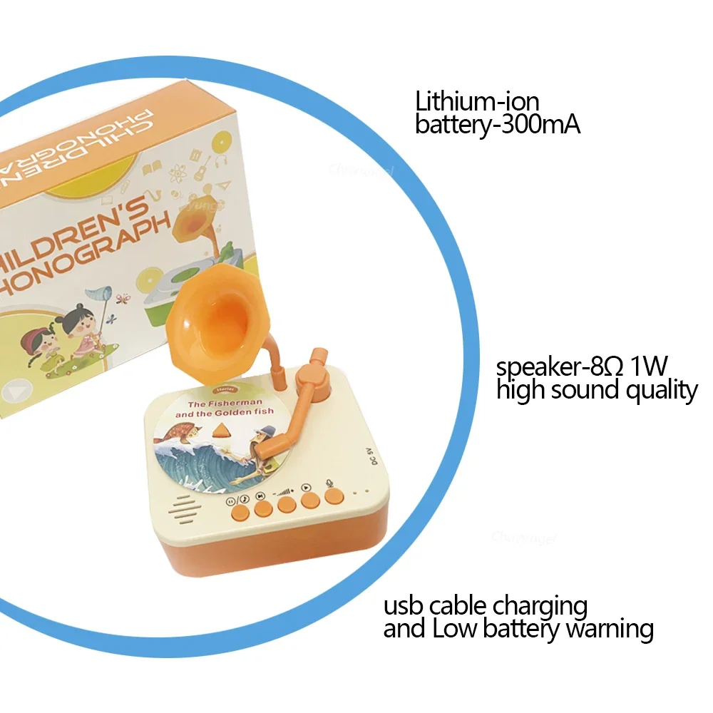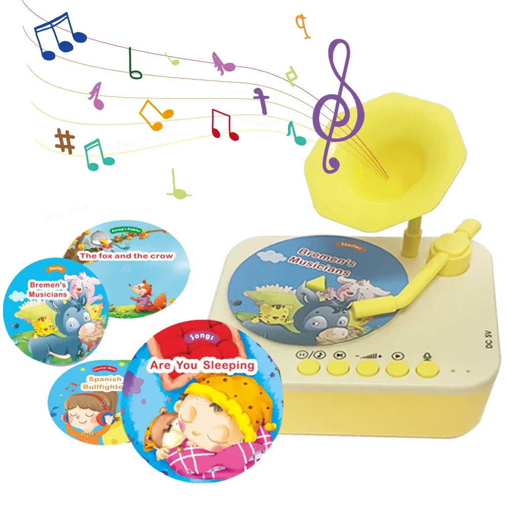 2. Interactive Kids Phonograph for Learning and Fun: Ideal for educational play, it enhances early learning while keeping kids entertained. The children gramphone has 96 different cards includes 43 stories, 8 aesop's fables, 26 song, 14 classical music, 1 collection of songs and 4 DIY cards. The DIY cards can can record your own voice.